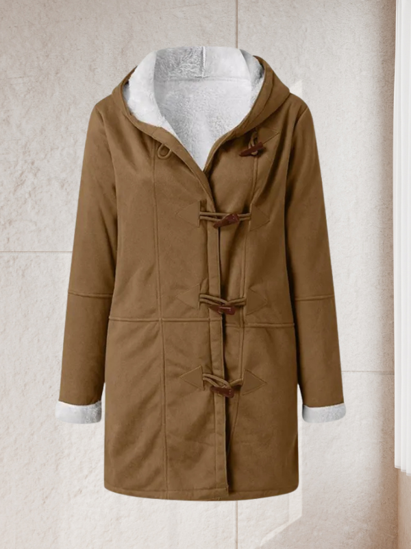 Dieser gemütliche Mantel im Shearling-Stil vereint Wärme, Komfort und zeitlose Wintermode in einem. Die weiche, wildlederähnliche Außenseite in warmem Kamelbraun wird von einem plüschigen cremefarbenen Fleecefutter ergänzt, das sich über Revers, Kragen und Ärmelaufschläge erstreckt und für Struktur und einen ansprechenden Kontrast sorgt. Die leicht übergroße, entspannte Passform eignet sich ideal zum Tragen über Pullovern und Strickkleidung, während die Länge bis zum Oberschenkel hervorragenden Schutz vor Kälte bietet. Funktionale Knebelverschlüsse setzen einen klassischen Akzent und sichern den Mantel, ohne seinen lässig-eleganten Stil zu beeinträchtigen.