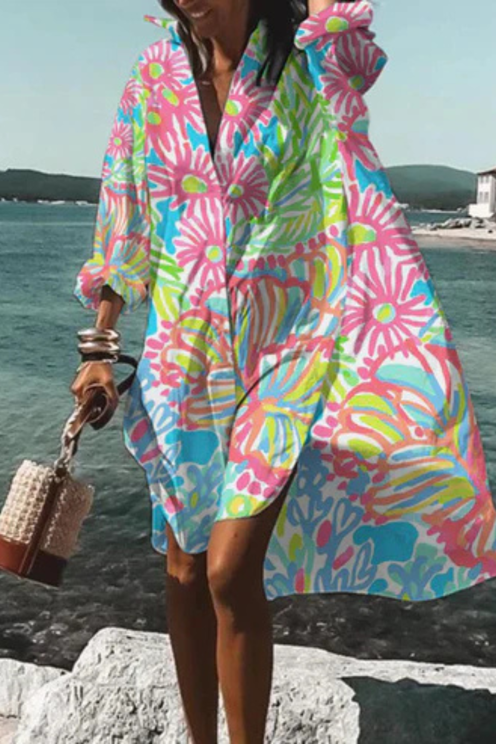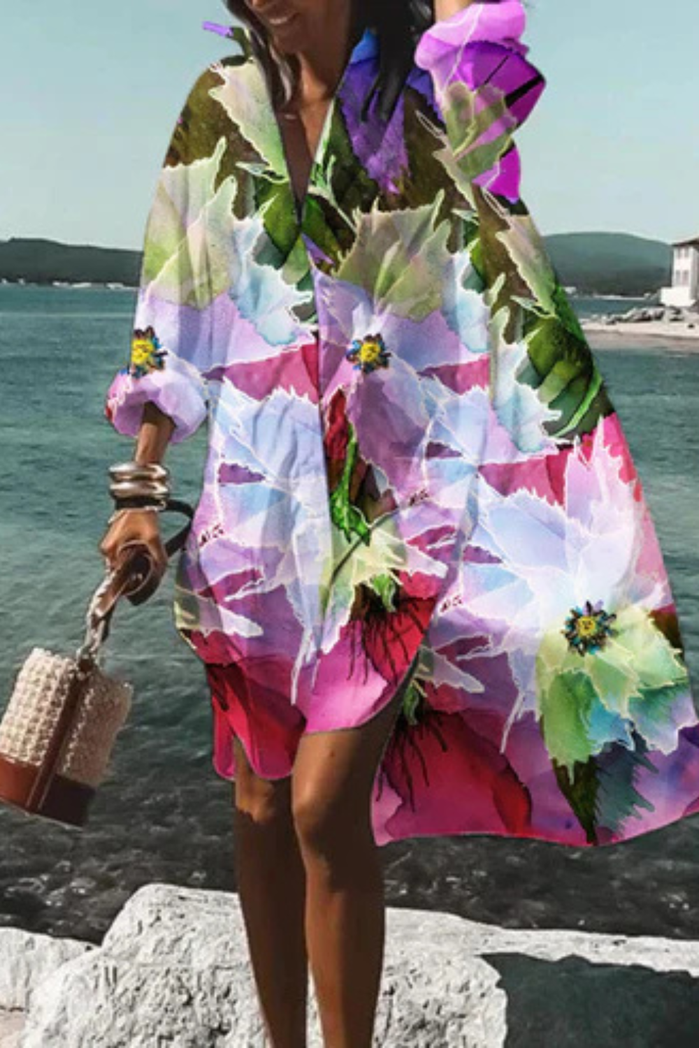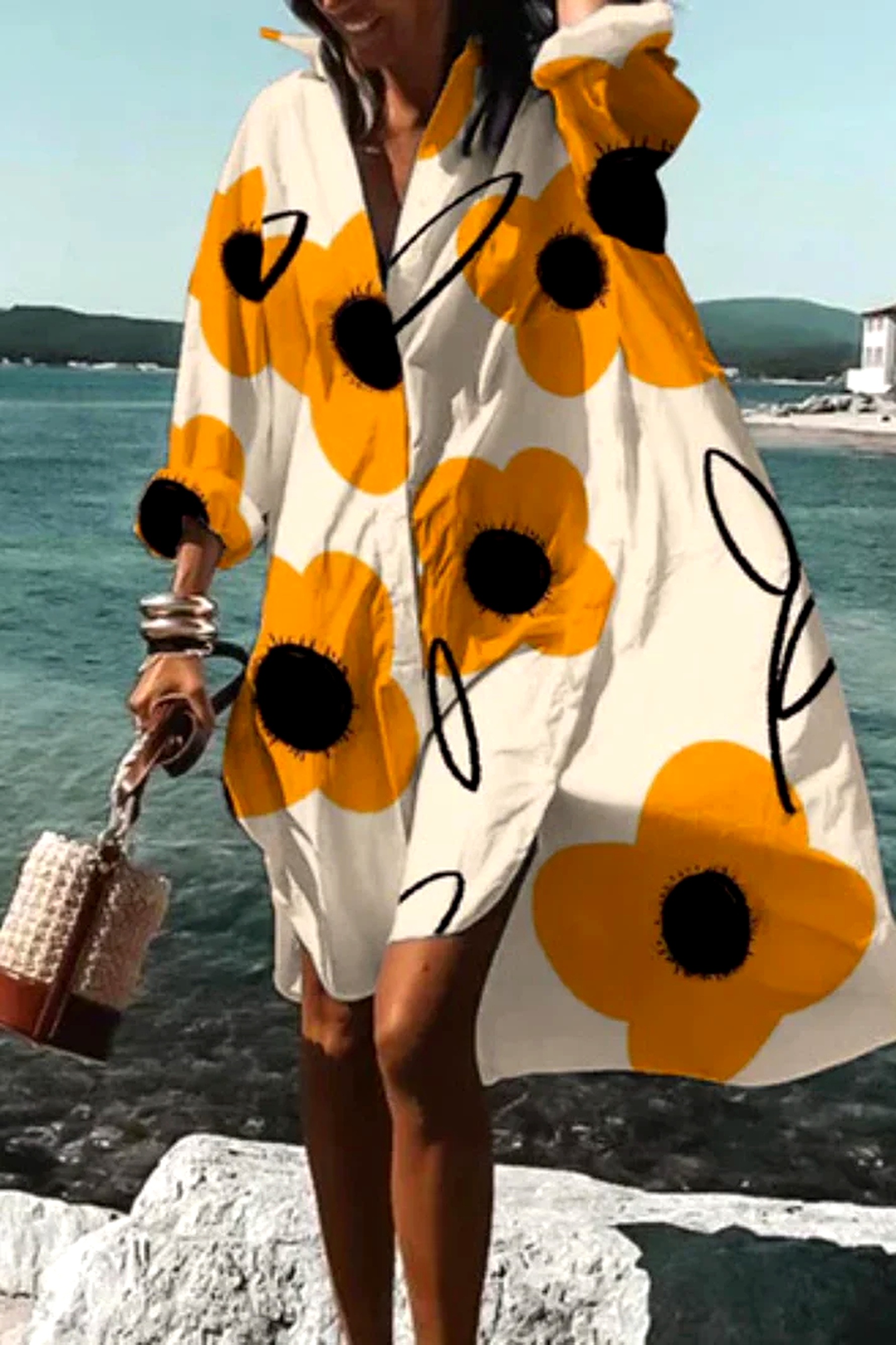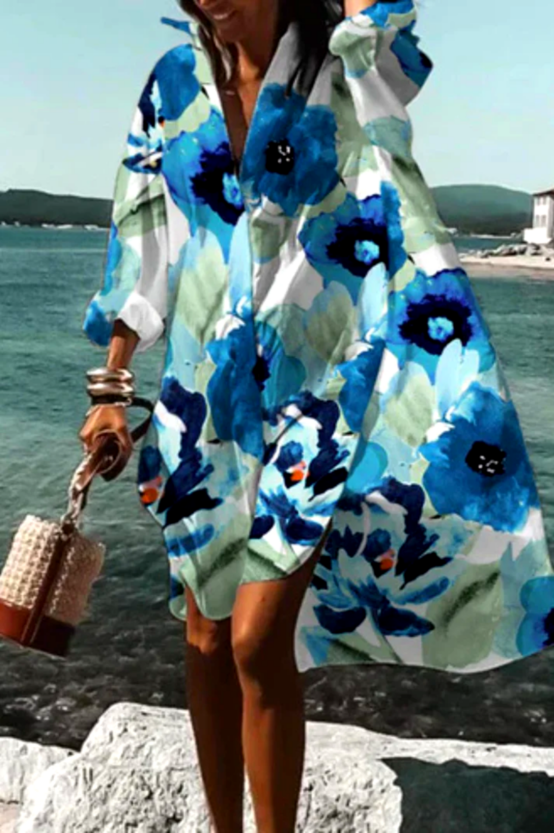 Dieses Kleid vereint sommerliche Leichtigkeit mit moderner Eleganz. Der lockere Schnitt und der ausdrucksstarke Blumenprint machen es zum idealen Begleiter für Urlaubstage, Spaziergänge am Meer oder stilvolle Alltagslooks. Die fließende Form sorgt für Bewegungsfreiheit und eine mühelos feminine Ausstrahlung.